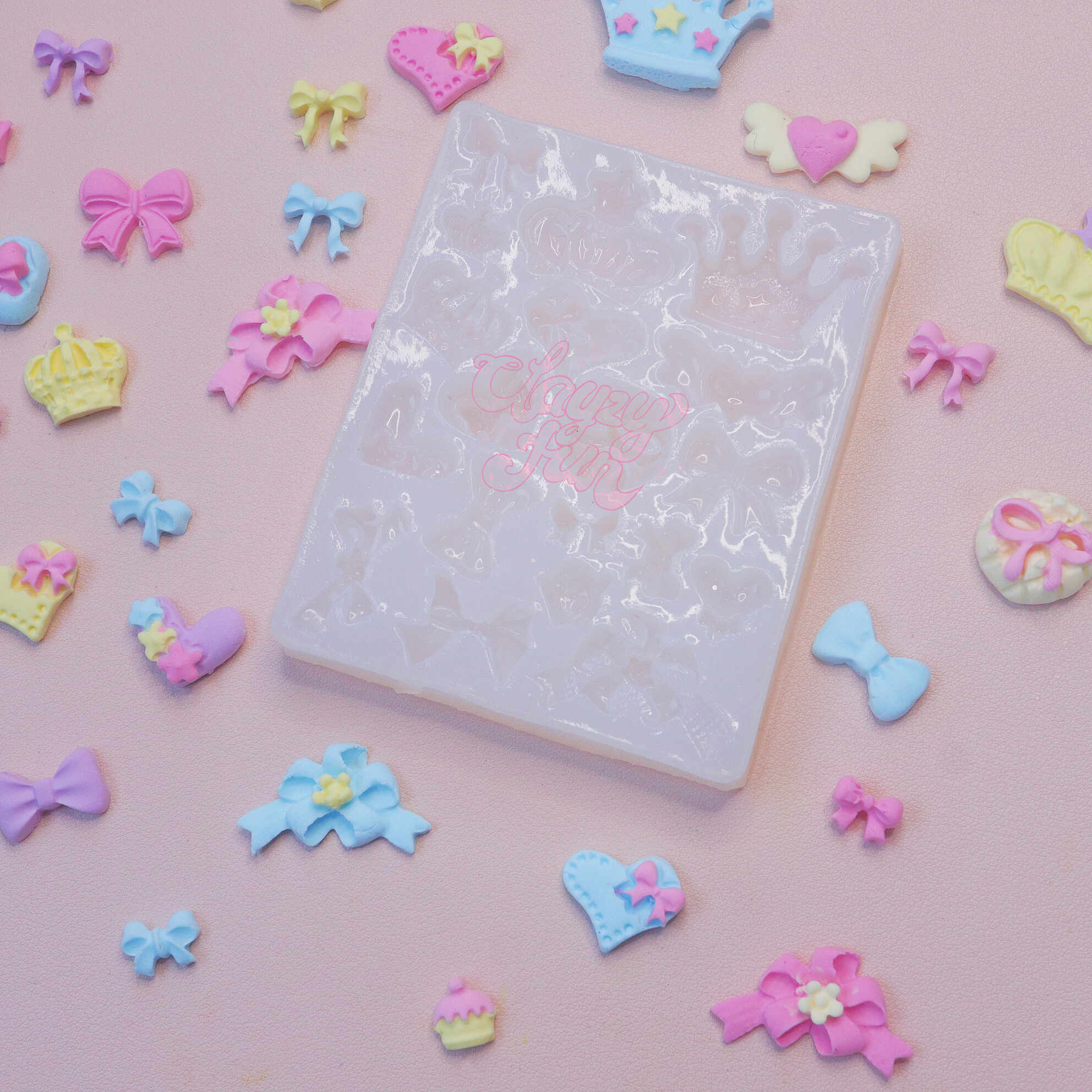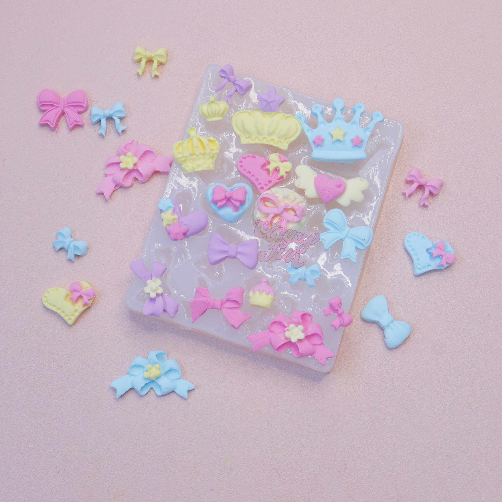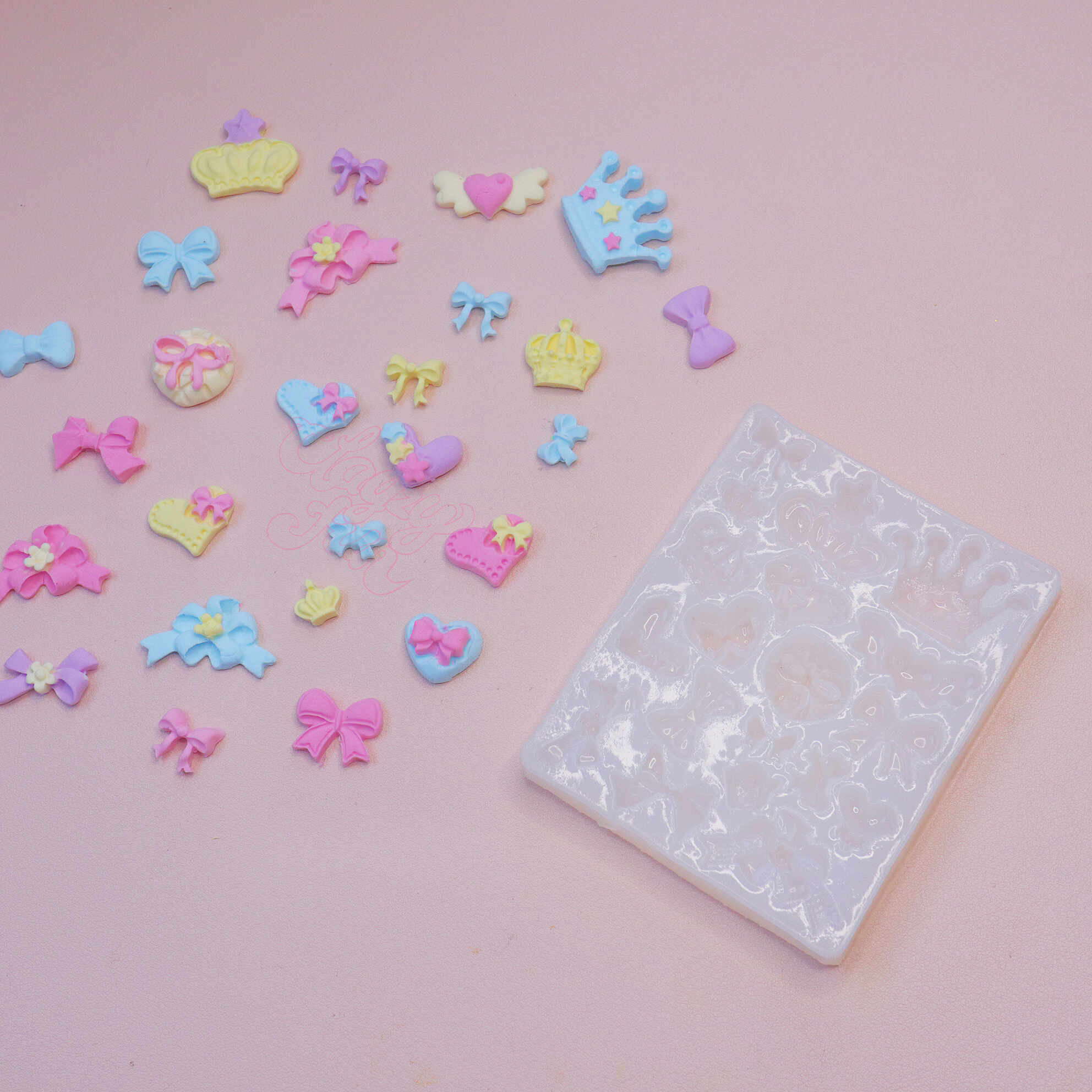 Introducing the Multi-Shape Silicone Mold: Perfect for Crafting Bows and Crowns, your ultimate tool for creating intricate and charming decorations for your DIY projects. This versatile mold, as showcased in the images, allows you to craft a variety of shapes including bows, crowns, hearts, and more with ease and precision.