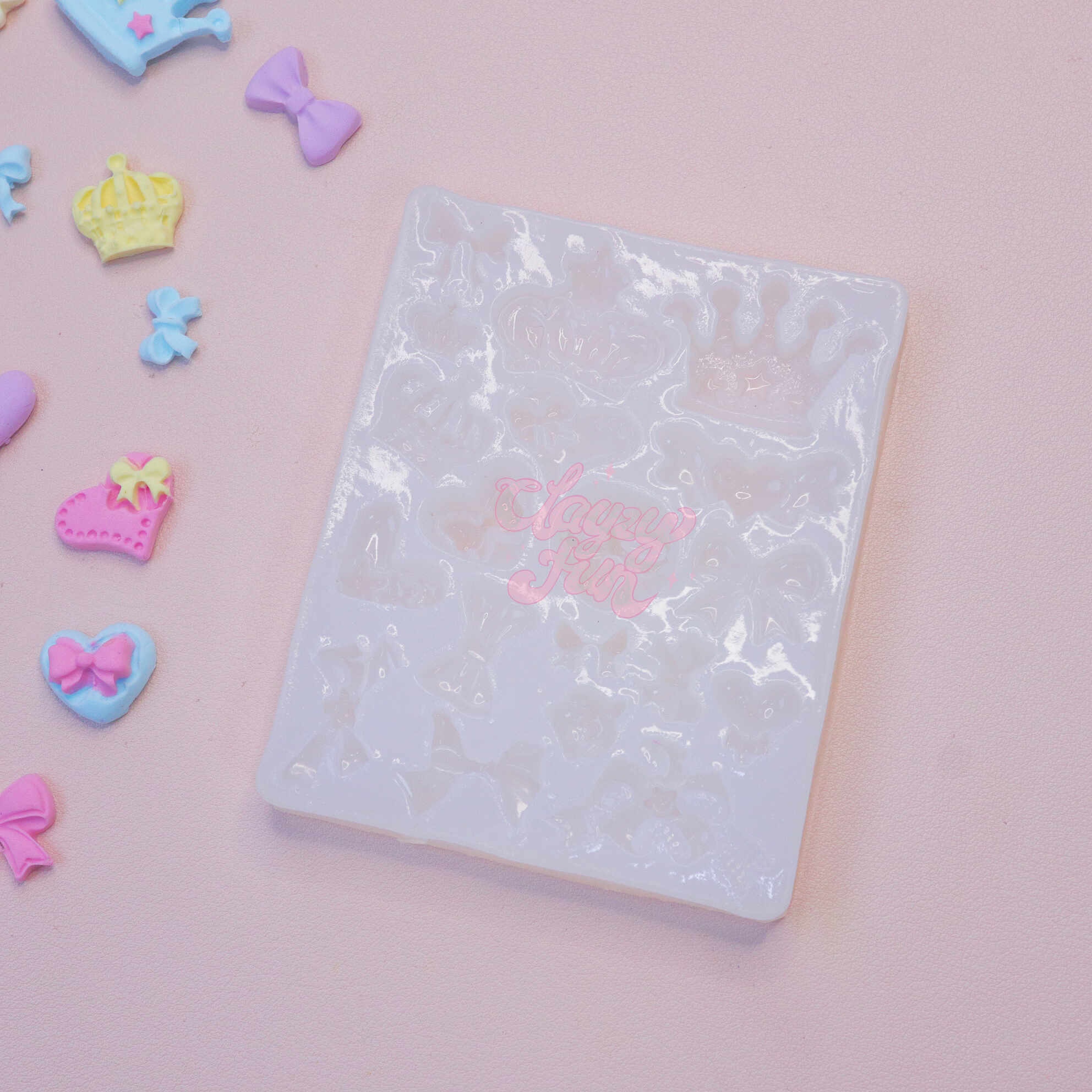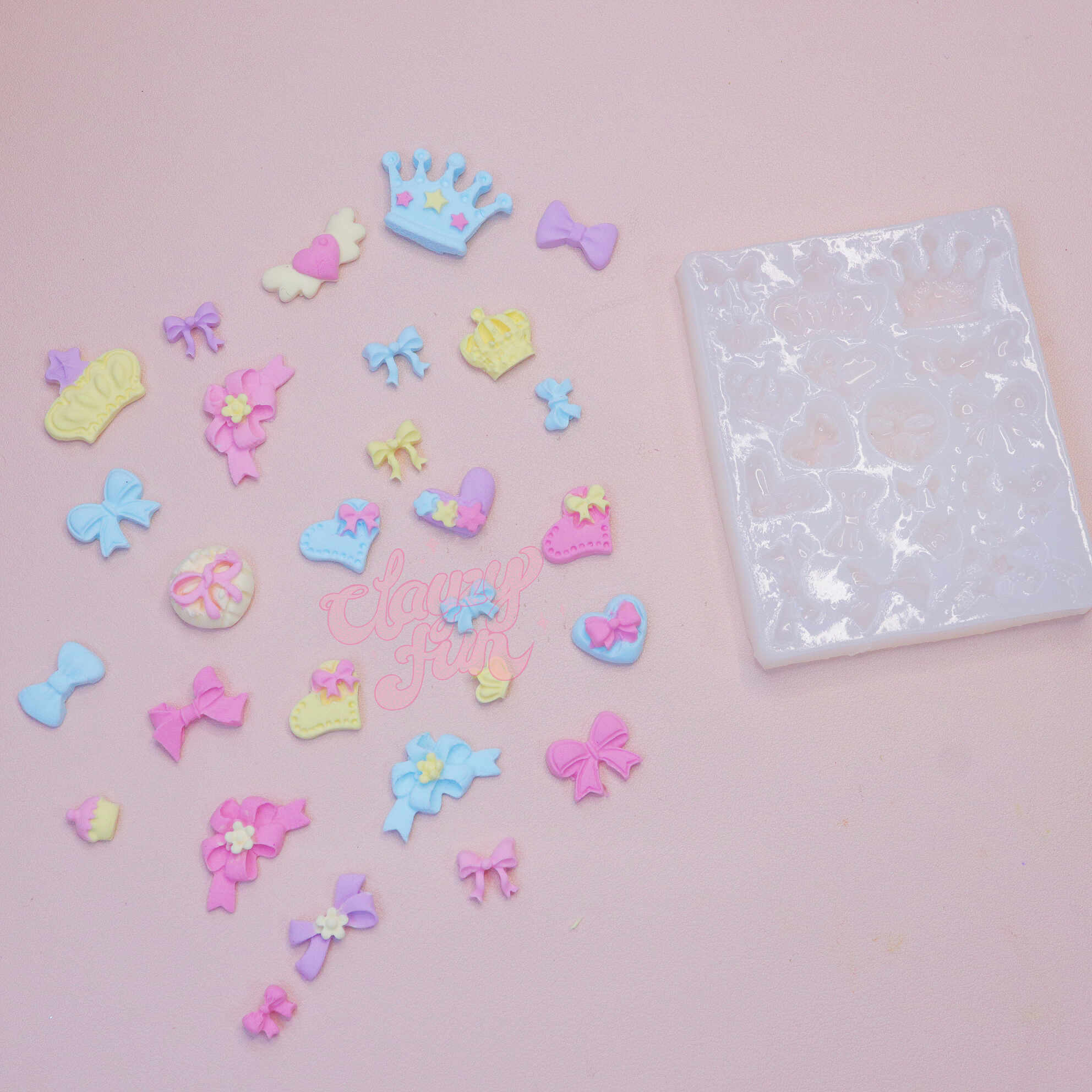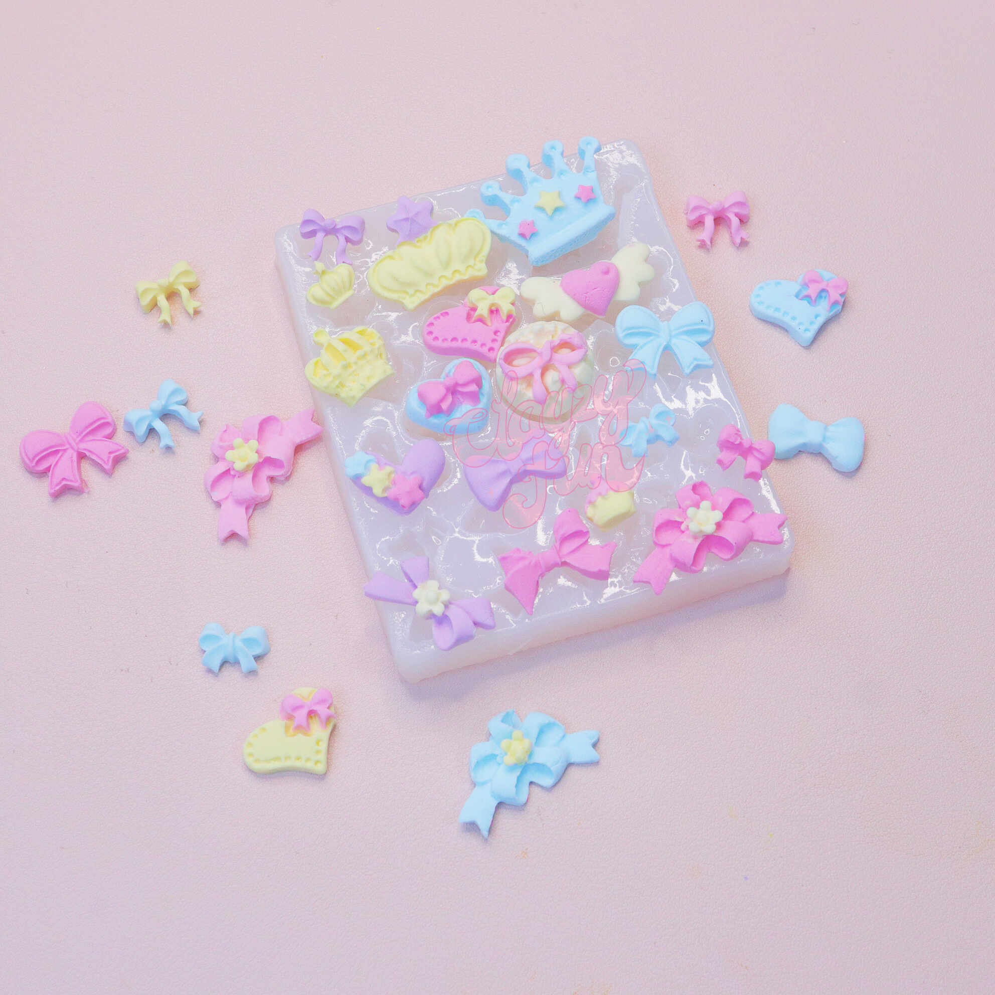 Introducing the Multi-Shape Silicone Mold: Perfect for Crafting Bows and Crowns, your ultimate tool for creating intricate and charming decorations for your DIY projects. This versatile mold, as showcased in the images, allows you to craft a variety of shapes including bows, crowns, hearts, and more with ease and precision.